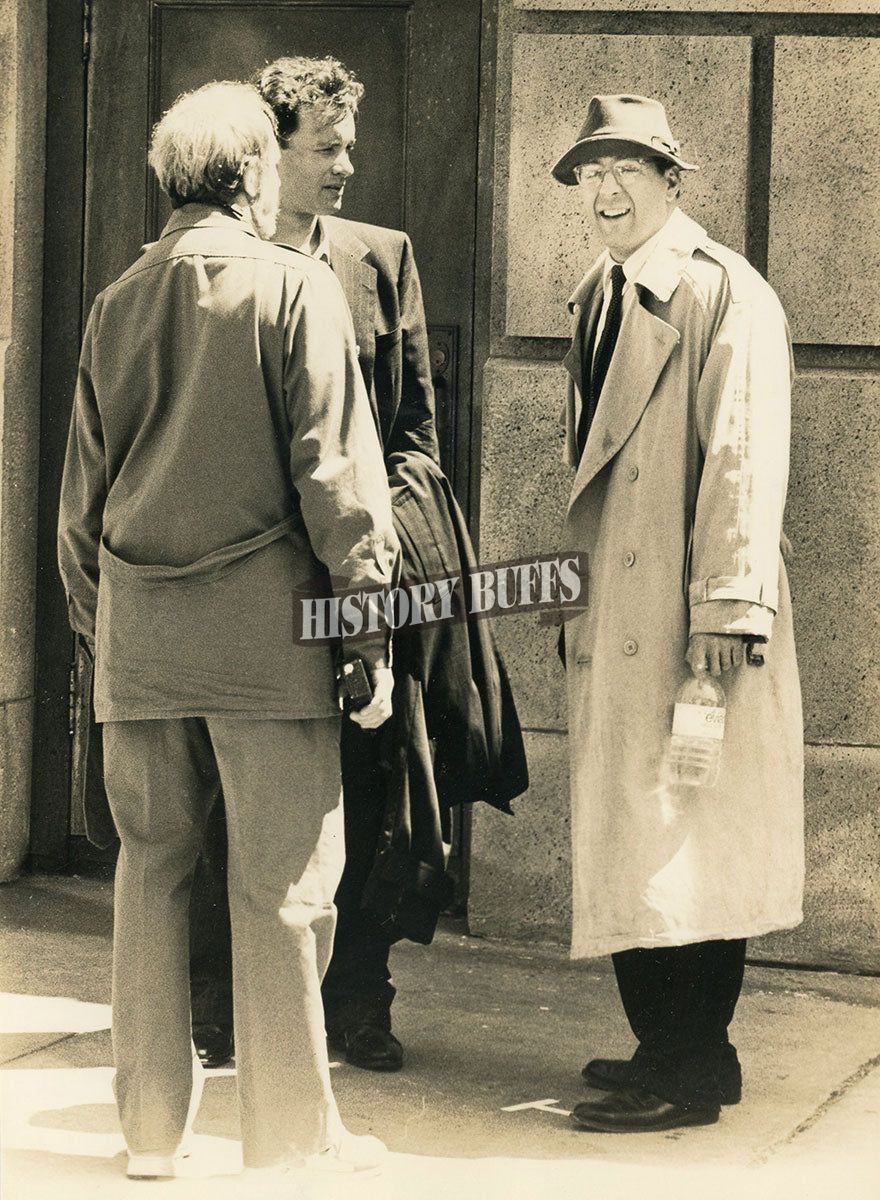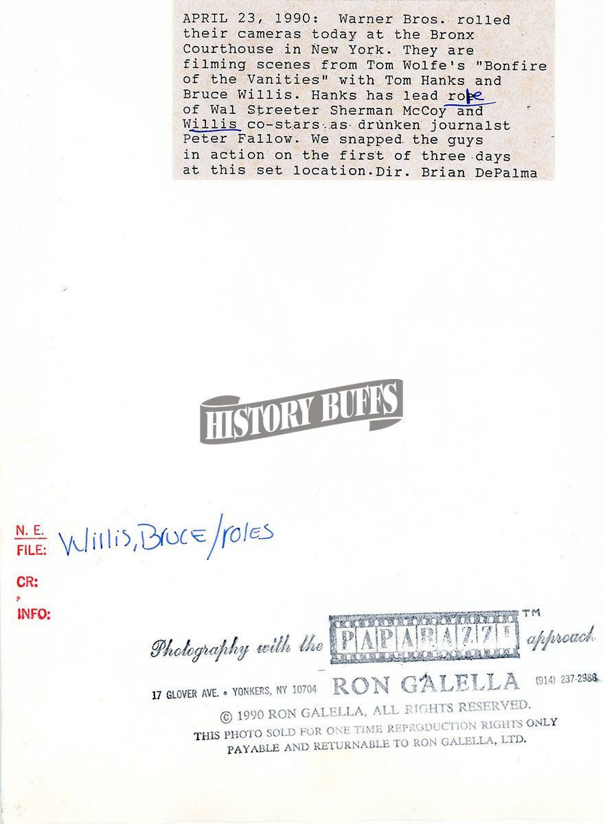 APRIL 23, 1990: Warner Bros. rolled their cameras today at the Bronx Courthouse in New York. They are filming scenes from Tom Wolfe's 'Bonfire of the Vanities' with Tom Hanks and Bruce Willis. Hanks has lead role of Wall Streeter Sherman McCoy and Willis co-stars as drunken journalist Peter Fallow. We snapped the guys in action on the first of three days at this set location. Dir. Brian DePalma.
