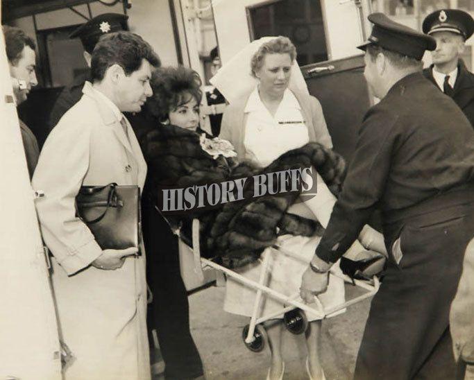 ELIZABETH TAYLOR LEAVES FOR CALIFORNIA, CARRIED FROM THE AMBULANCE."