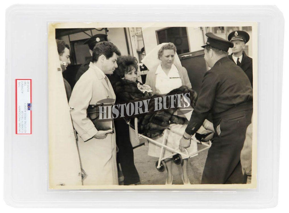 "Airport – Screen star ELIZABETH TAYLOR today left London Airport for California to recuperate after her recently serious illness. Her left leg is affected by ‘chronic thrombosis’ caused by injections treatment she received. She was carried by wheelchair. Husband EDDIE FISHER accompanied her."