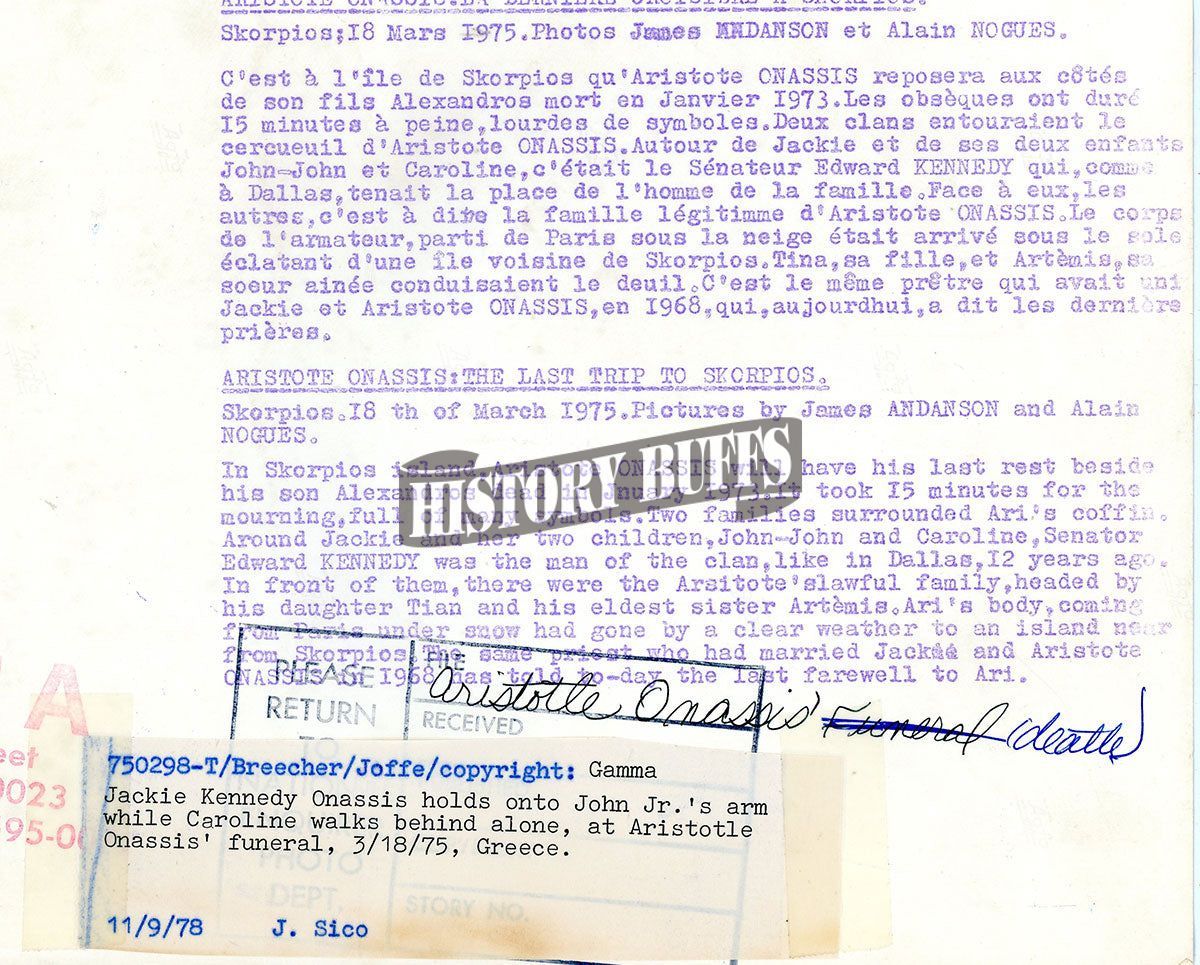 It is on the island of Skorpios that Aristotle ONASSIS will rest alongside his son Alexander, who died in January 1973. The funeral ceremony lasted barely 15 minutes, heavy with symbolism. Two clans surrounded Aristotle ONASSIS’s coffin. Around Jackie and her two children, John-John and Caroline, was Senator Edward KENNEDY, who, as in Dallas, took the place of the family’s male figure. Opposite them were the others, that is to say, the legitimate family of Aristotle ONASSIS.